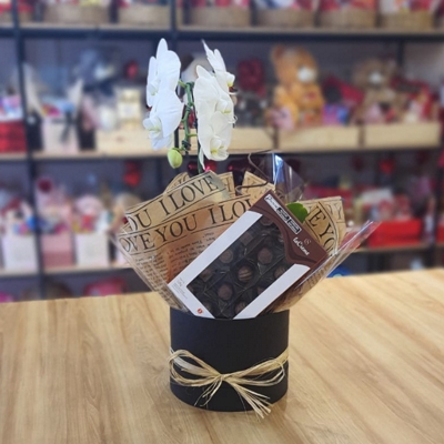A orquídea Phalaenopsis, símbolo de beleza, amor e admiração, vem cuidadosamente acomodada em uma box decorativa que realça sua elegância. Acompanha uma deliciosa barra de chocolate LaCrème – perfeita para adoçar o dia de quem recebe.