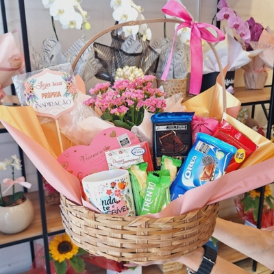 Cesta Presente com Flores e Guloseimas – Encante quem você ama com essa linda cesta montada com uma linda flor natural, chocolates, caneca e itens especiais que transmitem carinho e cuidado.