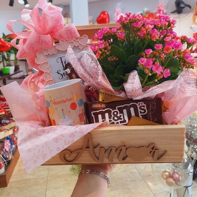 Essa composição reúne uma mini kalanchoe rosa, flor símbolo de boas energias e carinho duradouro, um porta-retrato para eternizar memórias, deliciosos M&Ms de chocolate, e uma linda caneca com a frase “Feliz Aniversário”, perfeita para usar todos os dias e lembrar desse gesto especial.