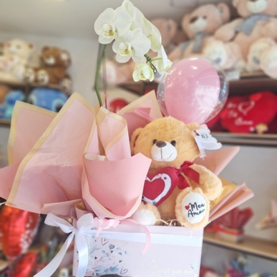 Demonstre todo seu carinho com a elegância e delicadeza dessa cesta especial! A Cesta Com Carinho traz a beleza da orquídea Phalaenopsis branca, símbolo de pureza e amor duradouro, acompanhada de um adorável urso de pelúcia com a frase "Meu Amor" e um mini balão bubble que transmite alegria e surpresa.