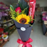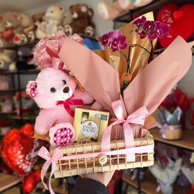 A mini orquídea roxa transmite elegância e boas energias, o urso de pelúcia oferece conforto e ternura, e os bombons Ferrero Rocher adicionam um toque de sabor e sofisticação. Um trio irresistível que emociona à primeira vista!