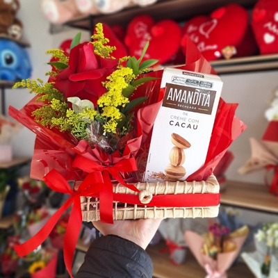 A rosa carola, símbolo de beleza e sofisticação, acompanha um delicioso chocolate Amandita, garantindo sabor e afeto em um só presente. Tudo disposto em uma cestinha charmosa, pronta para encantar.