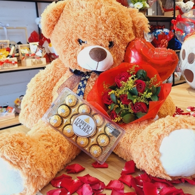Declare todo o seu amor com um presente que emociona em cada detalhe! O Kit Amor reúne tudo o que há de mais romântico e encantador: um urso de pelúcia grande, superfofo e abraçável; um buquê com 6 rosas vermelhas, símbolo da paixão e do amor verdadeiro; uma deliciosa caixa de Ferrero Rocher, com bombons finos e sofisticados; e um balão de coração, que completa a surpresa com um toque divertido e apaixonado.