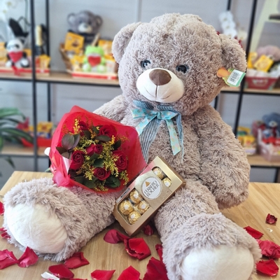 O presente perfeito para declarar seu amor de forma inesquecível! O Kit Mozão reúne três clássicos do romantismo: um urso de pelúcia grande e super fofo, um buquê de rosas vermelhas naturais — símbolo eterno da paixão — e uma caixa de bombons Ferrero Rocher, conhecida por sua sofisticação e sabor irresistível. Um combo encantador para surpreender o amor da sua vida!