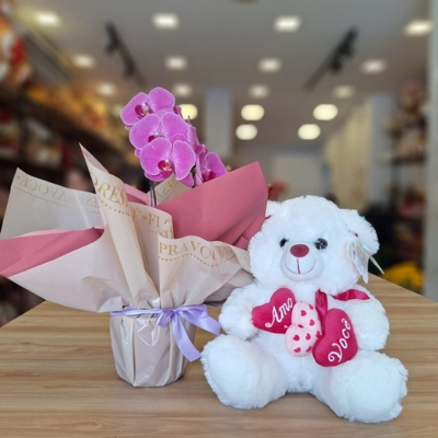 Encante logo no primeiro olhar! Esta delicada Orquídea em tons suaves vem acompanhado de um ursinho de pelúcia apaixonante, formando um presente perfeito para demonstrar carinho de forma doce e inesquecível.