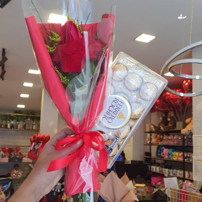 Encante com um gesto cheio de carinho e elegância com o Mimo com Rosa Vermelha Decorada e Ferrero Rocher. Esse presente delicado é perfeito para surpreender em datas especiais ou demonstrar afeto no dia a dia. A rosa vermelha, símbolo do amor e da paixão, vem lindamente decorada com detalhes que realçam sua beleza. Para completar, acompanha um Ferrero Rocher, bombom sofisticado que adiciona um toque de sabor irresistível ao momento.