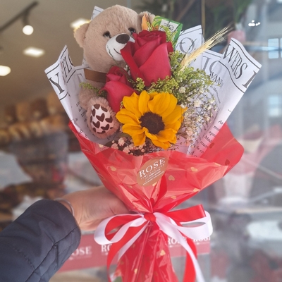 Perfeito para presentear com estilo e ternura, o Mini Buquê une flores frescas e um ursinho adorável que transmite amor e cuidado.