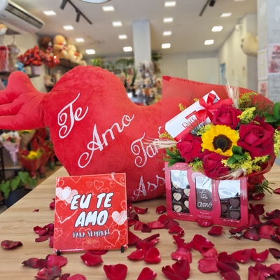 Presente “Eu Te Amo” com Flores, Chocolates e Pelúcia